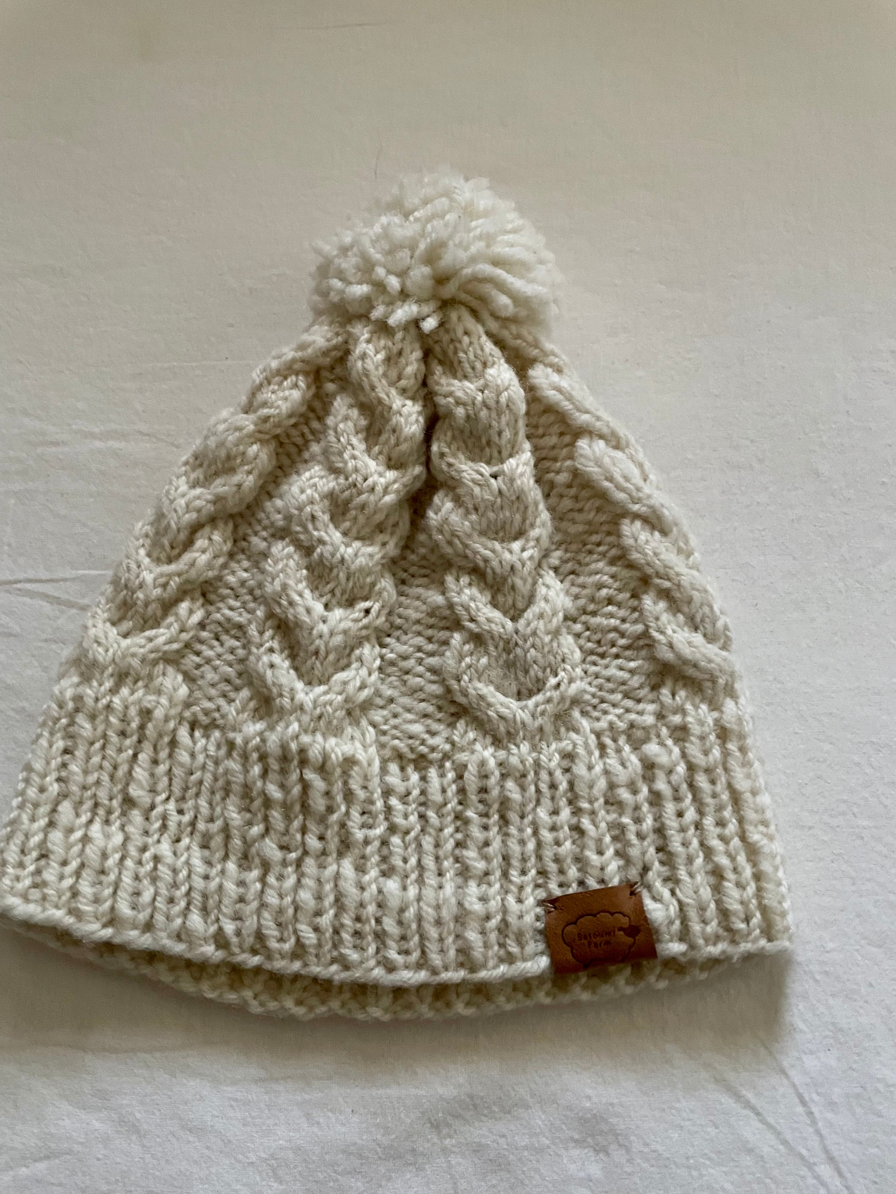 さとうみファームの羊毛を手紡ぎで糸にし、編んで作りました。自然の風合いがとてもかわいいニット帽です。羊の革のタグ付きです。